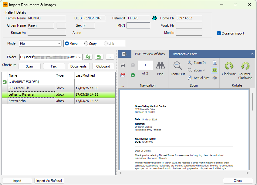 Use the Import Documents & Images screen to bring external files such as scanned documents, referrals, and images into a patient's record. Documents can be imported individually, as multi-page documents, or pasted directly from the clipboard.