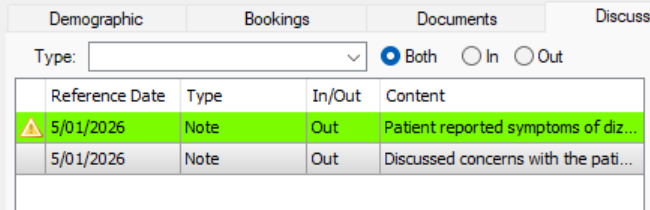 The Discussions tab is used to document patient interactions such as notes, emails, phone calls, and in-person conversations. In hospital environments, it is most commonly used for recording nursing end-of-shift handover notes.