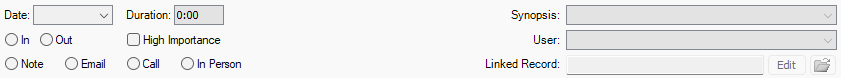 - In the top-right of the screen, fields such as synopsis, contact type (In/Out), interaction type (Note/Email/Call/In-Person) can be populated.