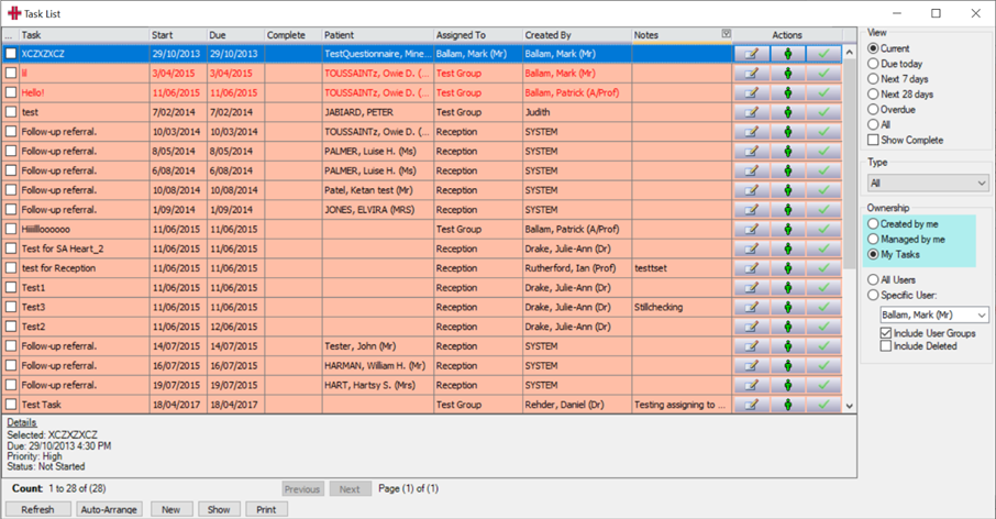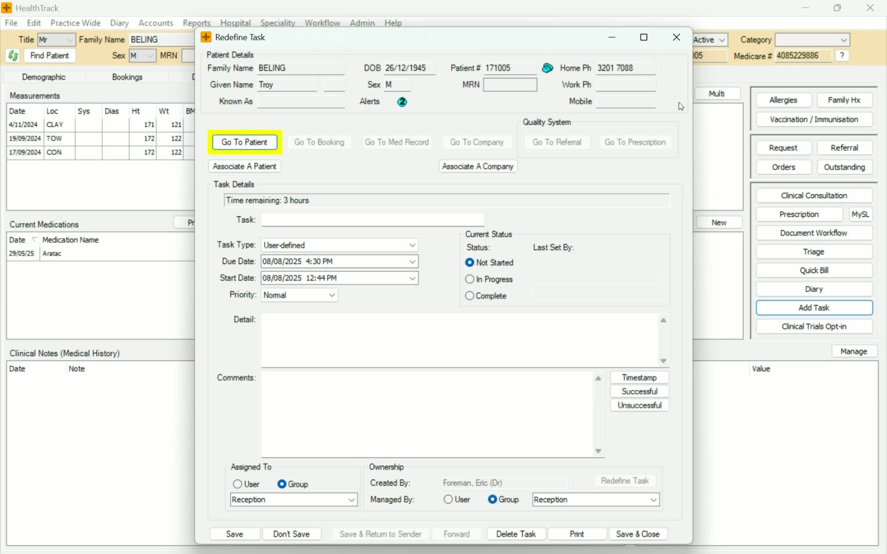 Tasks document work related to patient care, quality management, and medico-legal records. Tasks are never deleted - they create a permanent record. Every HealthTrack user can create tasks and have tasks assigned to them. Tasks can be associated with a patient, booking, referral, company, or prescription, and can also serve as reminders or follow-ups between users.
