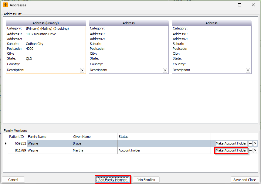Add Family Memberand search for the alternate account holder and select them. - Under the 'Family Members' section of the 'Addresses' screen, then select