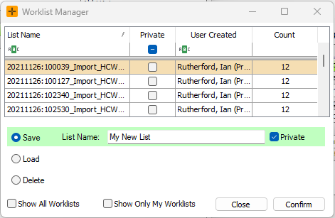 A saved Worklist can be accessed via Edit > Patient Worklist and selecting the Manage button. Select the Worklist from the table and choose 'Load' and Confirm.