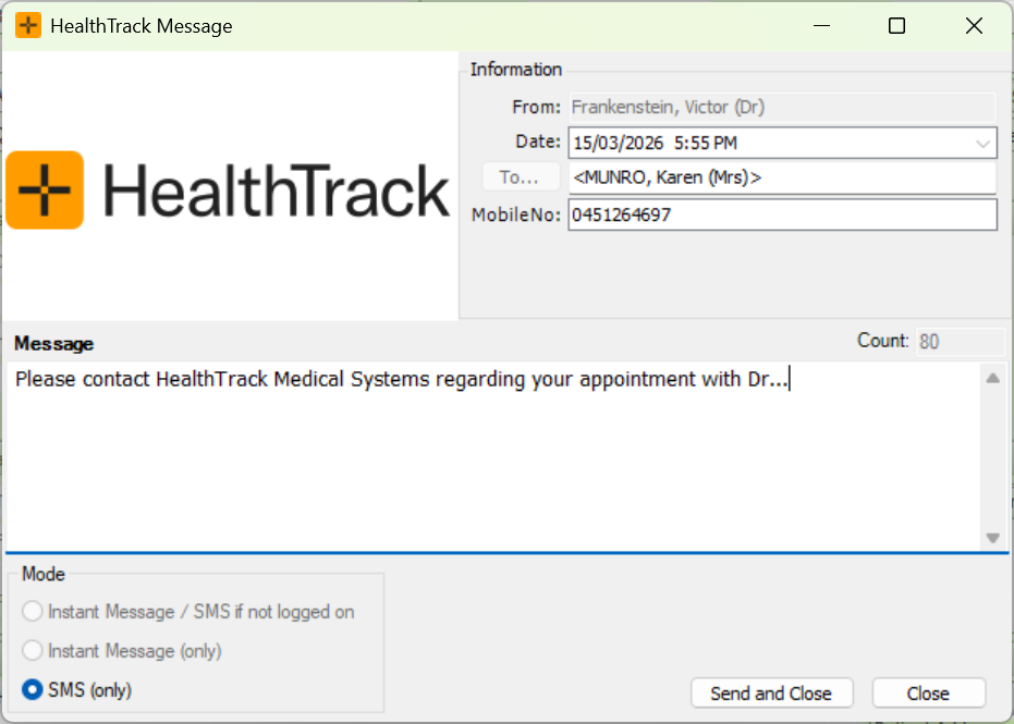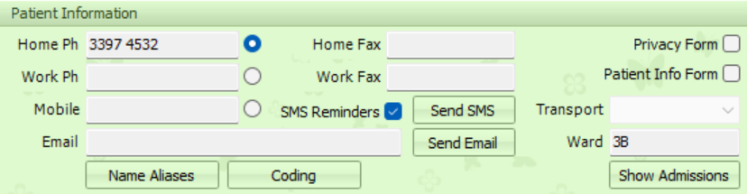Use the Send SMS or Send Email buttons in a the patient's Demographics screen to send an SMS or email directly. Sent and received messages are stored and can be reviewed at any time.
