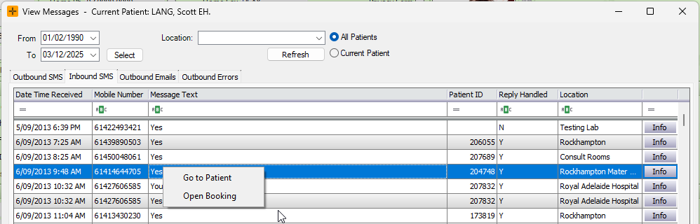 - Right-click on a particular message to 'Go to Patient' or 'Open Booking'.