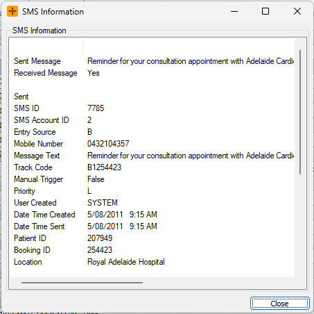 For further information, you can select the Info button next to a particular message to open the SMS Information screen.