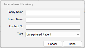 Unregistered Bookings can be used to create a booking without associating it with a particular patient. As such, this feature can be used to log things such as meetings or notes in the Diary.