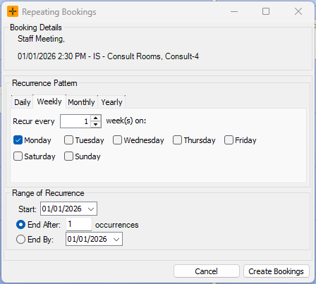 Unregistered bookings can also be made recurring by right-clicking the appointment in the diary and selecting 'Repeat Booking'. In the Repeating Bookings screen that displays, a recurrence pattern and range of recurrence can be set.