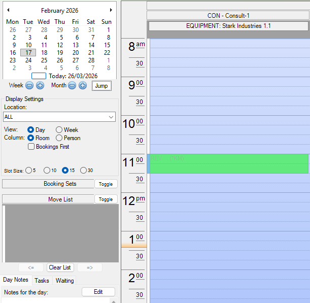 - Confirm the Day, Location, and Room are set correctly at the top of the diary.