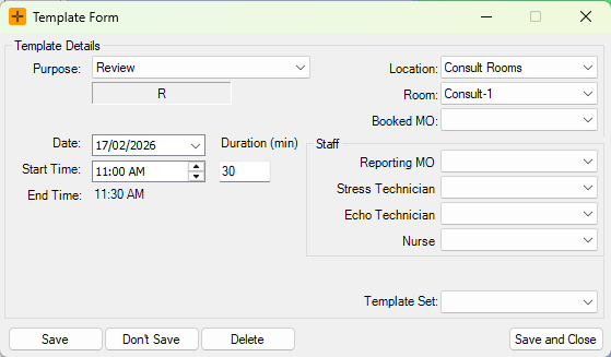 Booking templates define the appointment types, times, and providers available in the diary. They prevent double-bookings and help staff find availability quickly. Templates can be created directly in the diary (user-created) or managed centrally through the Diary Template Manager.