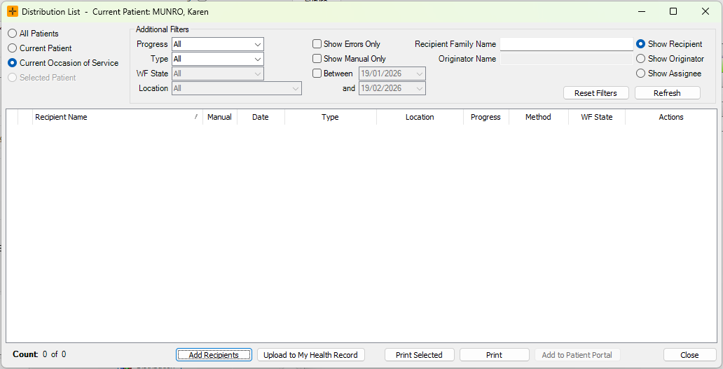 Recipients can be added to the Distribution List on a patient's Booking Form. When a clinical record is created for this booking, the recipients are automatically populated on the Distribution List for the current Occasion of Service.