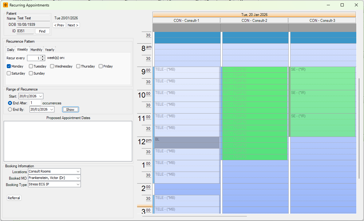 - Navigate to Diary > Recurring Appointment to open the Recurring Appointments window.