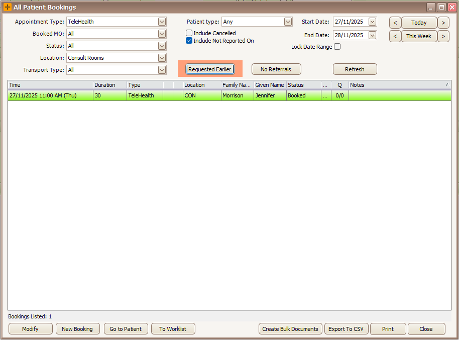 - In the All Patient Bookings screen, select the Requested Earlier button.