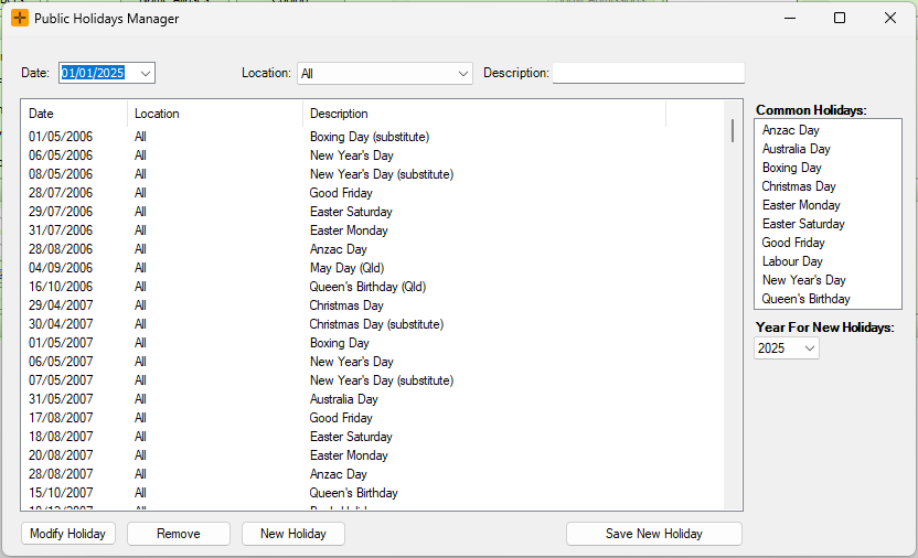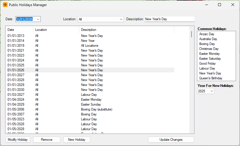 The Public Holidays Manager allows you to enter any public holidays into the diary in HealthTrack.