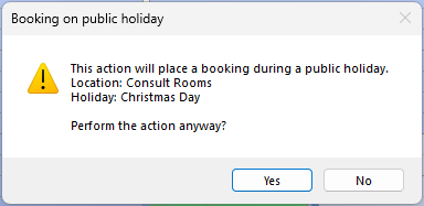 Additionally, when a booking is created on the public holiday, a warning will appear to notify you of the holiday.