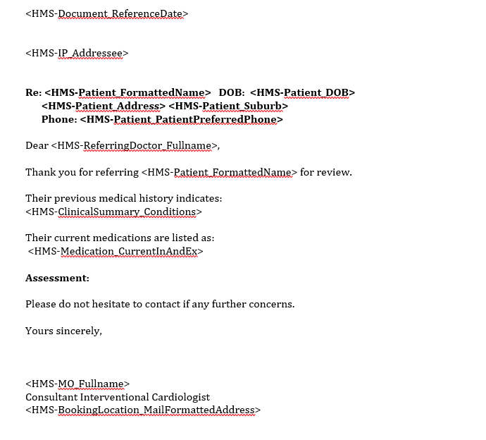Before configuring a template in HealthTrack, create the base file externally. Tags in the format <HMS-FieldName> will be replaced with live data when a letter is created from the template.