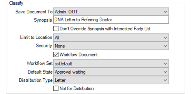 - In the Classify section, set Save Document To (the default Documents folder), enter the Synopsis, and configure Limit to Location and Security as needed.