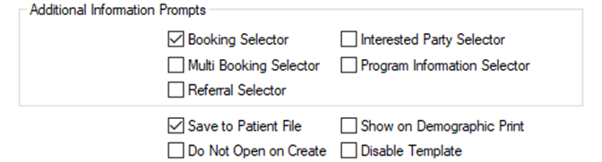 - Under Additional Information Prompts, tick any selectors the user should be prompted for when creating a letter (e.g. Booking Selector, Referral Selector, Interested Party Selector).