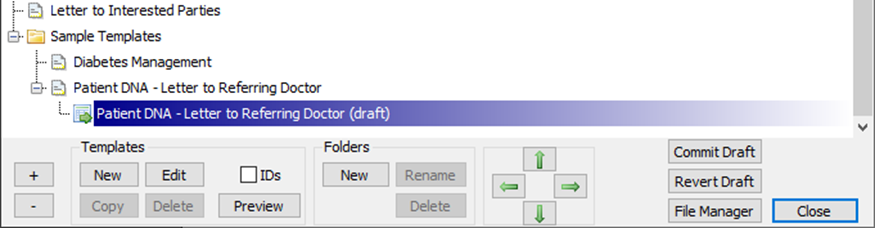 The Letter Template Manager toolbar provides controls for organising and maintaining your templates.