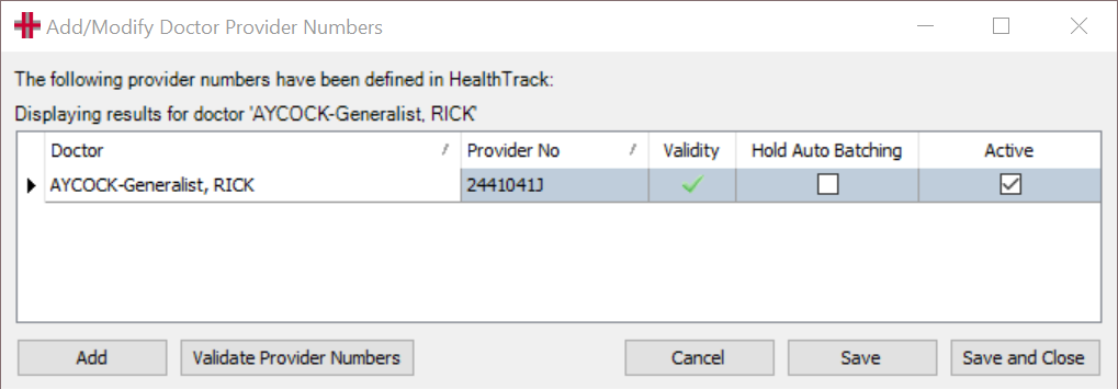 HealthTrack will validate the provider number and a green tick will appear in the 'Validity' column if it is valid.