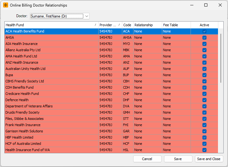 Edit Health Fund Relationshipsbutton on the right-hand side of the screen to bring up the Online Billing Doctor Relationships screen. - Select the Doctor from the drop-down list and set the relationship for each Health Fund (i.e. scheme).