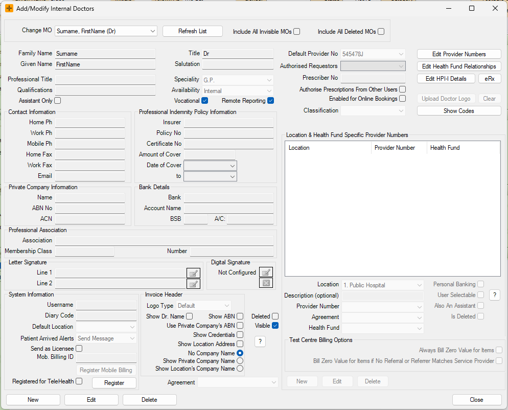 - In the Add/Modify Internal Doctors screen for the new doctor, enter relevant details (i.e. contact information, signature etc.).