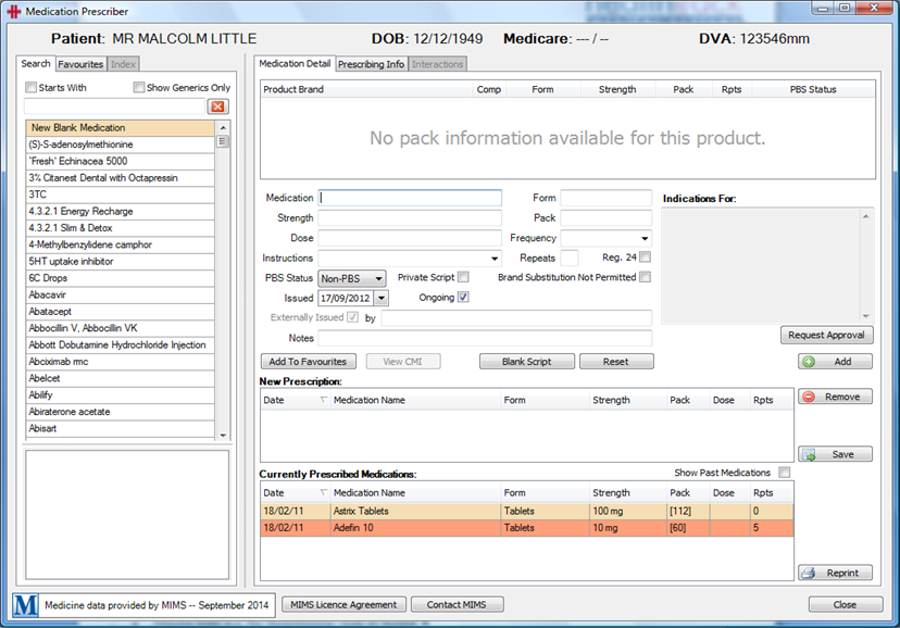 | PBS Status | Automatically set based on MIMS data and the patient’s Medicare/DVA details. Can be Non-PBS, PBS, or RPBS. |