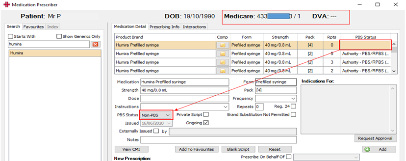 - If MIMS lists the medication as PBS and the patient has a valid Medicare number, PBS is selected.