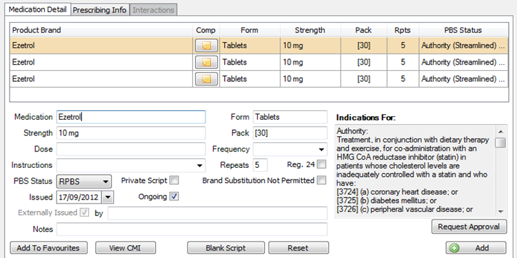 Streamlined Authority medications don’t require a phone call to Medicare or DVA, but you must enter an authority code. HealthTrack displays the required information in the Indications For panel.