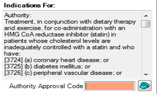 - Select the medication. The authority information and codes appear in the Indications For panel on the right.