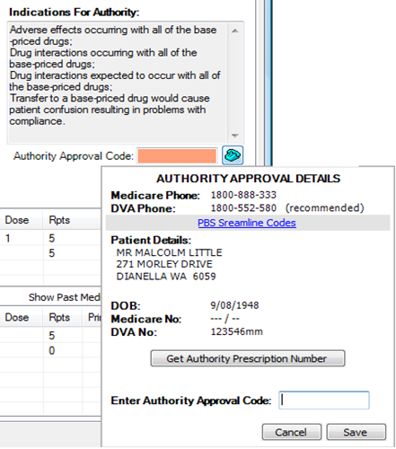 Request Approvalbutton. - In the Authority Approval Details dialog, click Get Authority Prescription Number to retrieve the number Medicare/DVA will need.