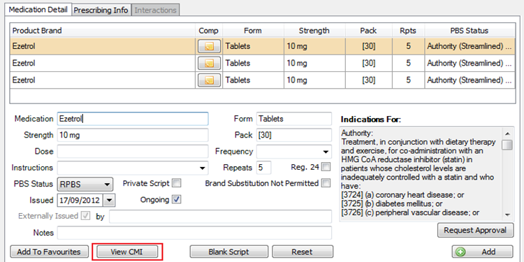 View CMIbutton on the Medication Detail tab to open the Consumer Medicine Information as a PDF, which can be printed for the patient.