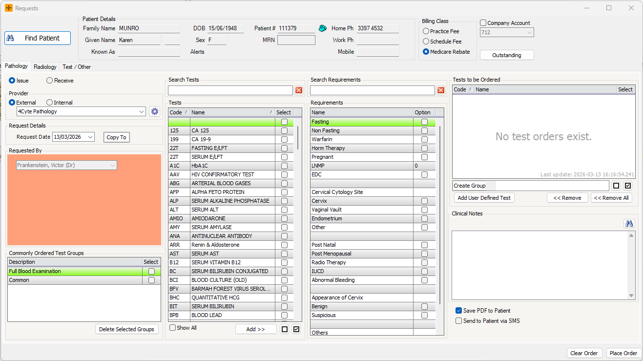 The Requests screen is used to create pathology, radiology, or other test requests for a patient. Access it from the Clinical Summary tab or from a Clinical Notes / General Consultations screen.