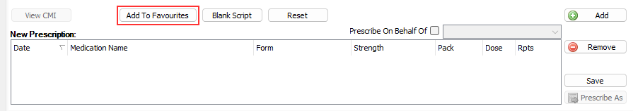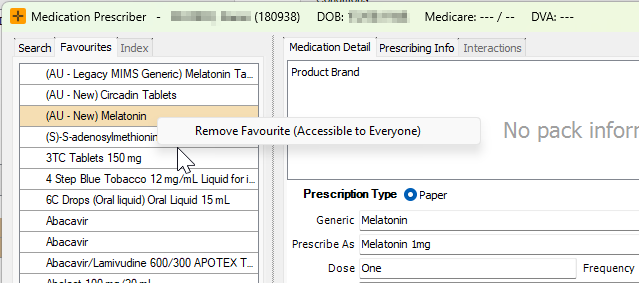 Favourites can also be removed by right-clicking on the medication in the 'Favourites' list, and selecting 'Remove Favourite'.