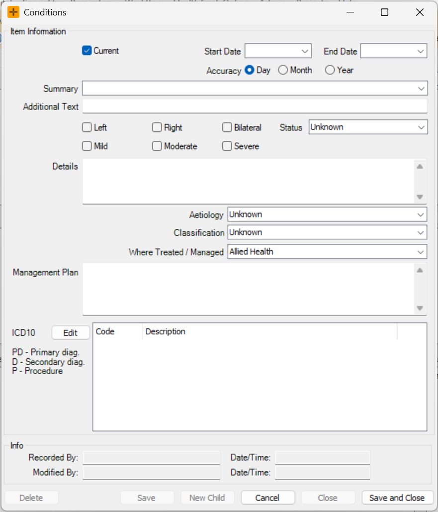 - In the Conditions screen, select an option from the drop-down list in the 'Summary' field, and/or enter the condition in the 'Additional Text' field.