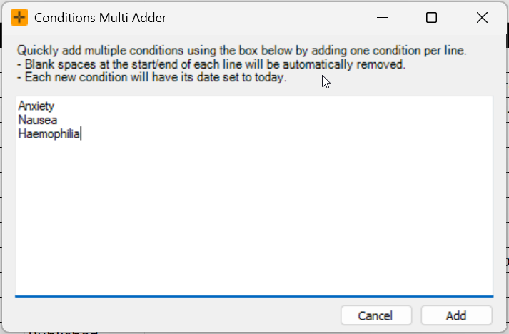 - In the Conditions Multi Adder screen, enter each condition on a separate line.