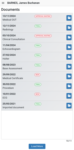 To open a record, select the blue folder icon on the right-hand side of the row. The document opens in a new window.