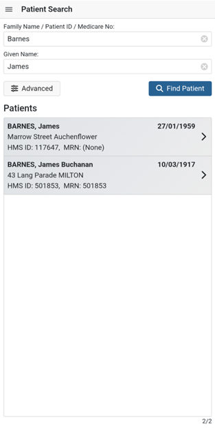 Find Patientoption. - Enter one or more search fields: Family Name, Given Name, Patient ID, or Medicare Number.