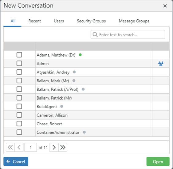 - In the New Conversation screen, use the search bar to find a user by name. Double-click a user or existing group to open the conversation.