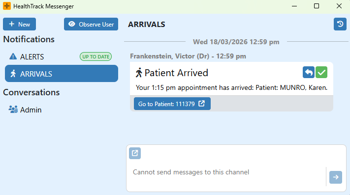 When a booking is set to the Arrived status, the booking's doctor automatically receives a notification in their Arrival channel.