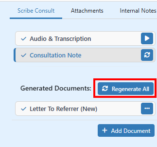 - If changes are made to the Consultation Note after generating the letters, the [Regenerate All] button can be used to create new letters. This will replace the existing letter and any changes that were made to it.