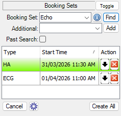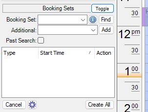 Toggleto expand the Booking Sets panel. - The Booking Sets panel appears with a drop-down to select a set, and buttons to search and create bookings.