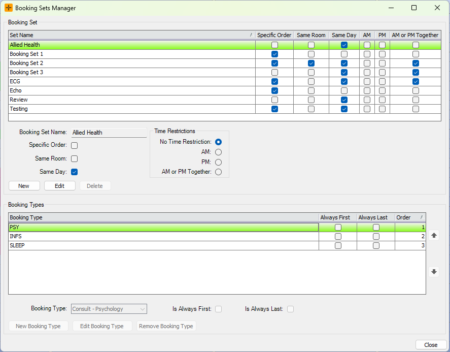 - Add booking types to the set using the Booking Type section at the bottom of the manager. Click